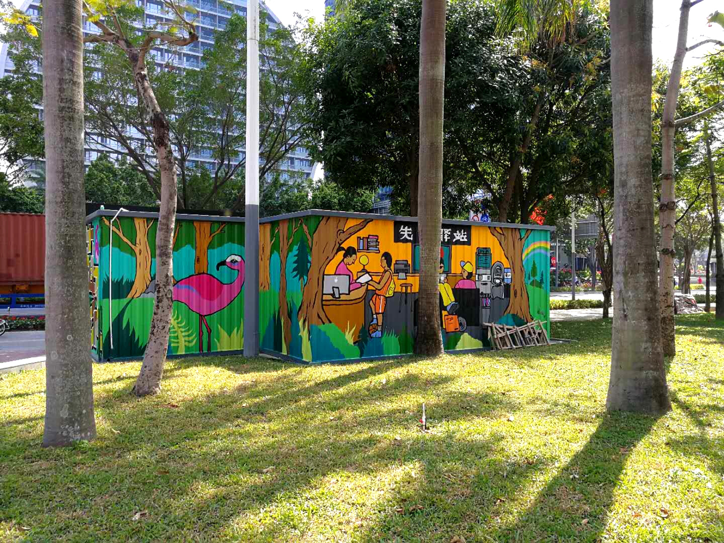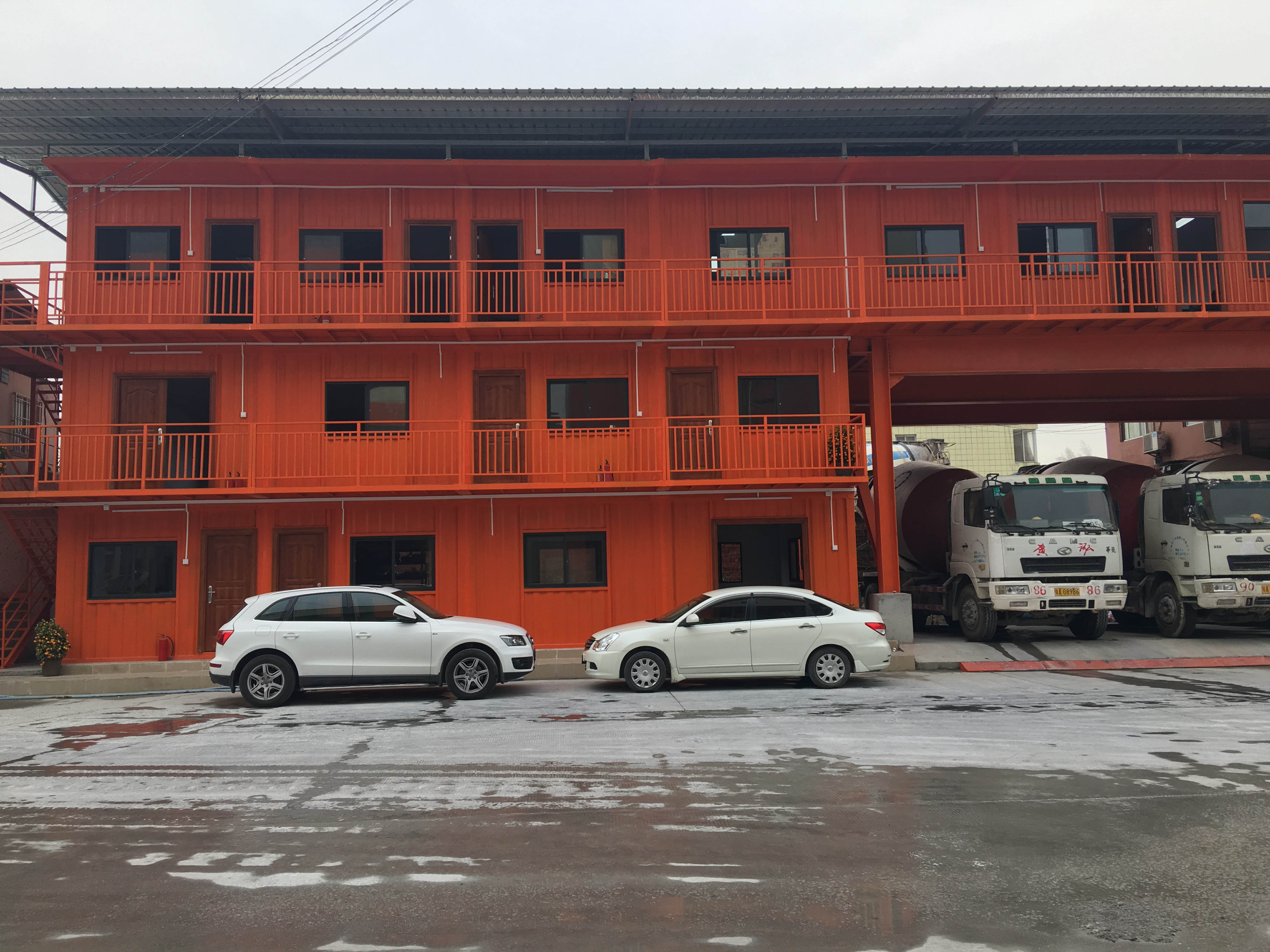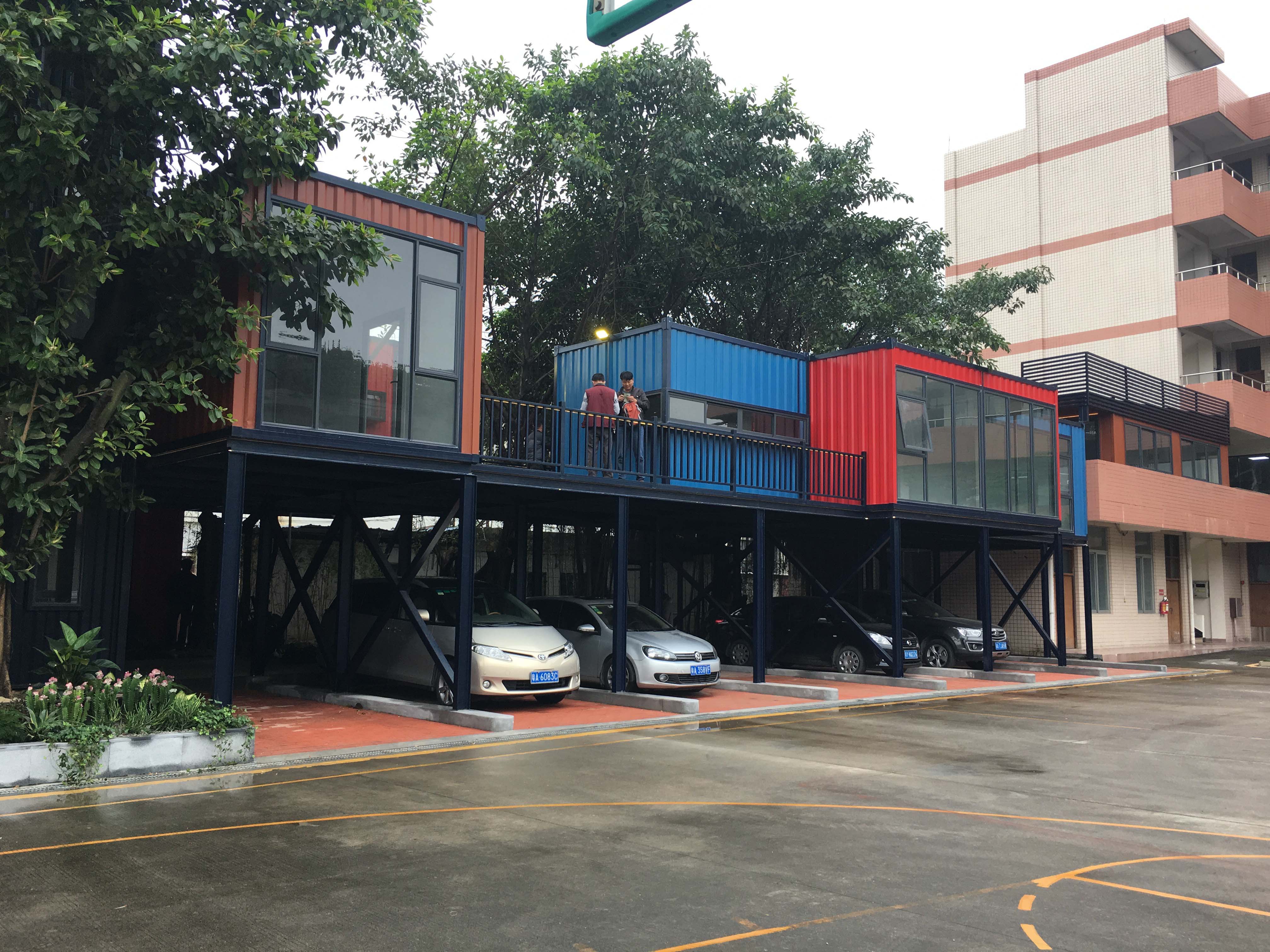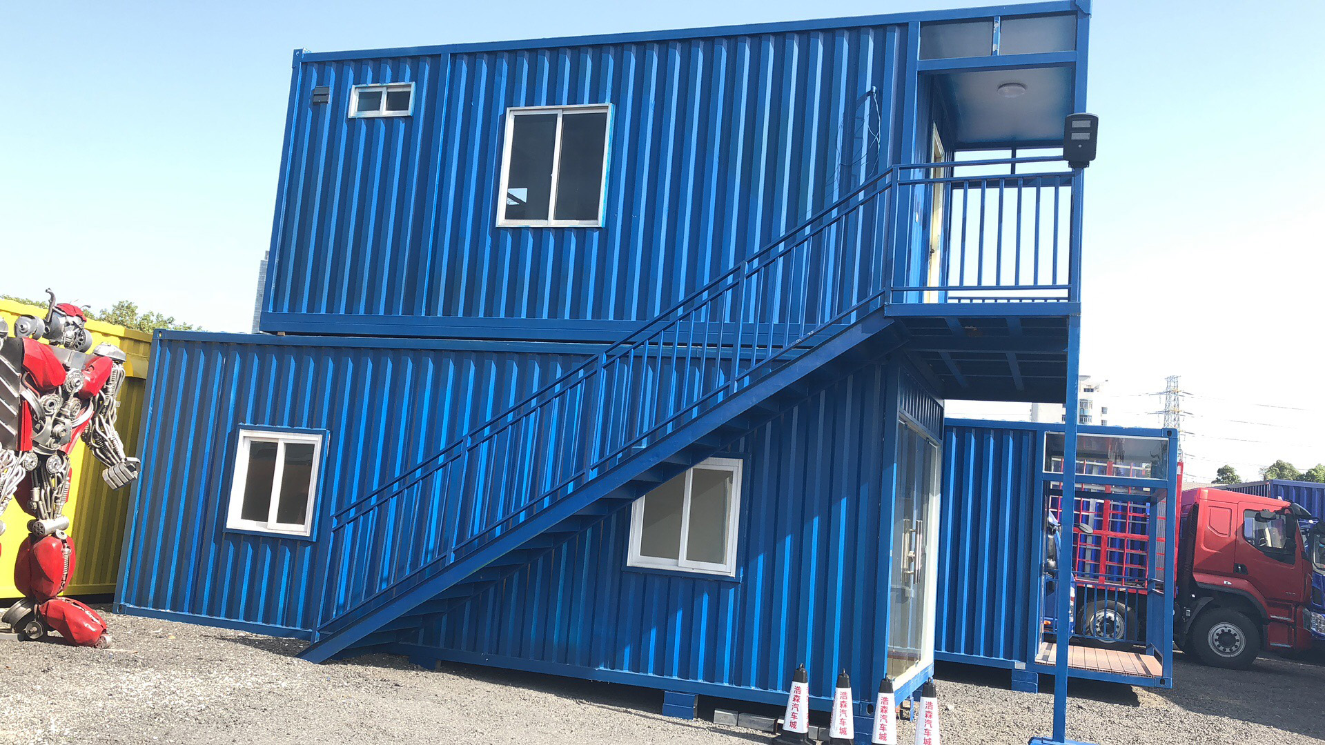 The office building is composed of several finished containers that have been relocated from Nansha District, with a connecting office area and a canteen on the second floor. On the third floor, an upright box of 12 meters is used as a stairwell...