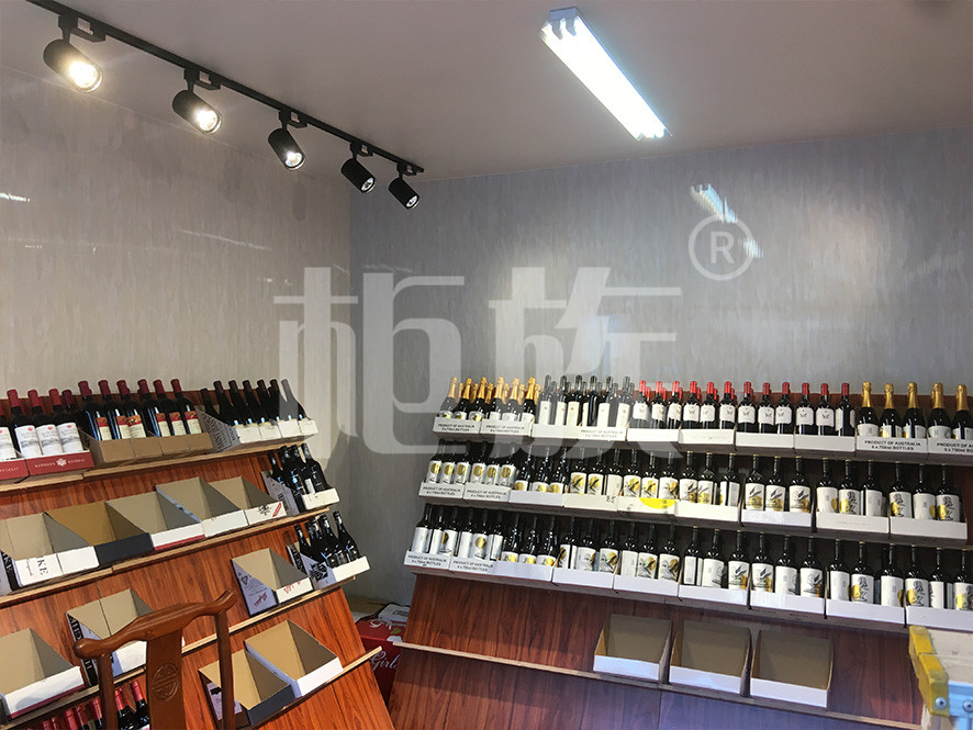 展柜外觀使用黑色噴漆,簡潔大氣。內部平面裝修,搭配射燈,視覺明凈,可以很好地將顧客的注意力吸引至琳瑯滿目的紅酒產(chǎn)品上。
