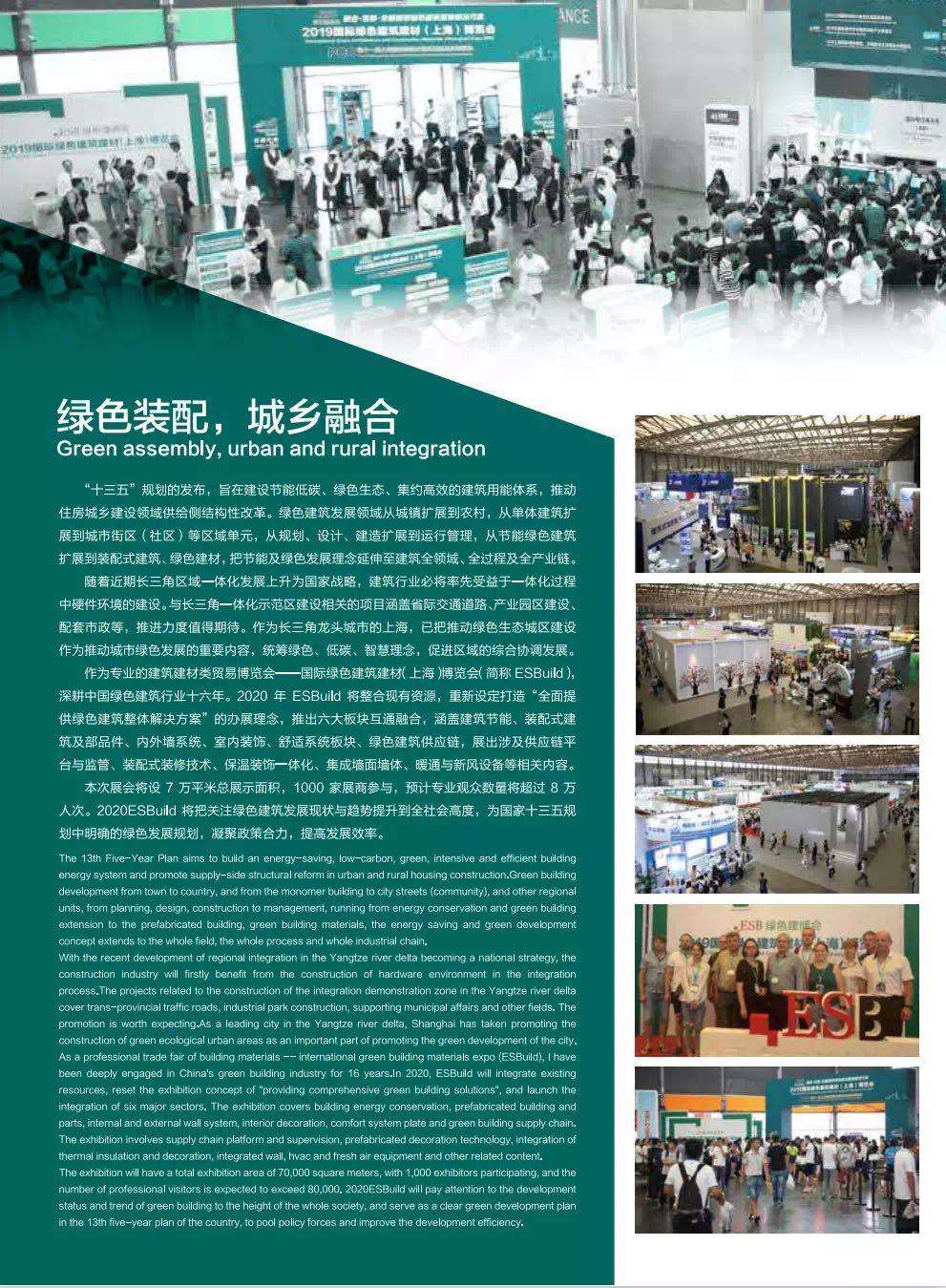 2020國際綠色建筑建材(上海)博覽會(2020ESBuild)于7月15日正式拉開帷幕。2020ESBuild以打造“全面提供綠色建筑整體解決方案”為理念,推出六大板塊互通融合,涵蓋建筑節(jié)能、裝配式建筑及部品件、內(nèi)外墻系統(tǒng)、室內(nèi)裝飾、舒適系統(tǒng)、綠色建筑供應(yīng)鏈,展出涉及供應(yīng)鏈平臺與監(jiān)管、裝配式裝修技術(shù)、保溫裝飾一體化、集成墻面墻體、暖通與新風設(shè)備等相關(guān)內(nèi)容。