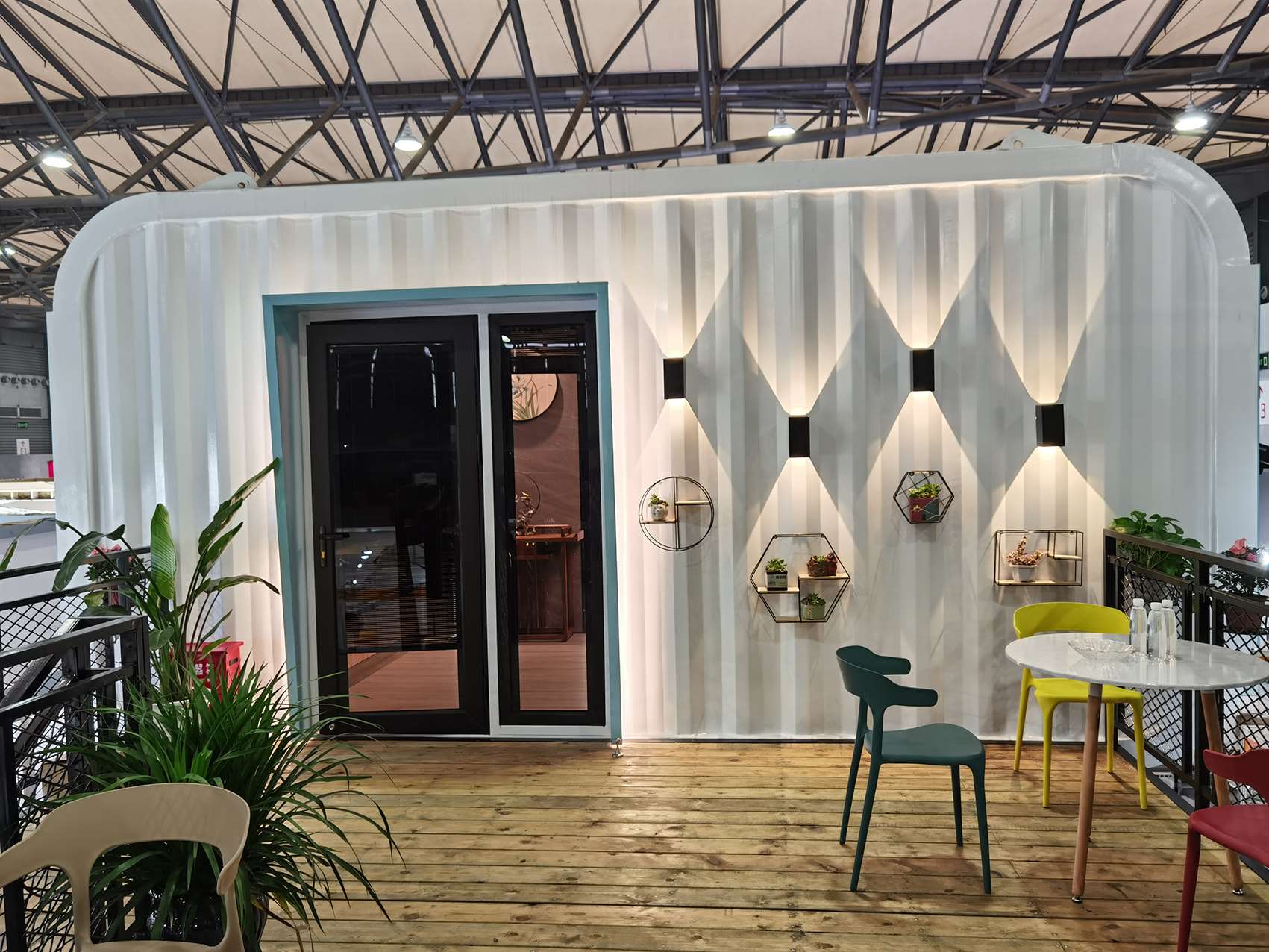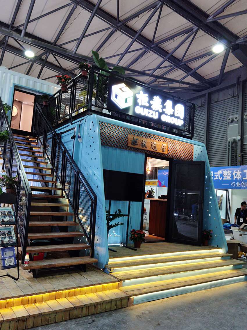 柜族本次參展的產(chǎn)品——逸海小筑位于E2裝配式建筑展區(qū)的2269展位,是一款以藍白為主色調(diào)、融入了水與波浪元素的海洋風集裝箱別墅。該產(chǎn)品的設(shè)計理念為環(huán)保、舒適、旅居,以不破壞場地與自然環(huán)境為出發(fā)點,整個產(chǎn)品為工廠預(yù)制完成,地面抬高3個臺階,有效隔離了地面的潮氣。箱子著力點有圓柱支撐,底座圓盤加大了受力面積和整體平衡性。箱子整體分為一、二層兩個模塊,用吊機和平板車整體裝卸運輸,在選好的平整地面直接擺放就可以入住使用了。