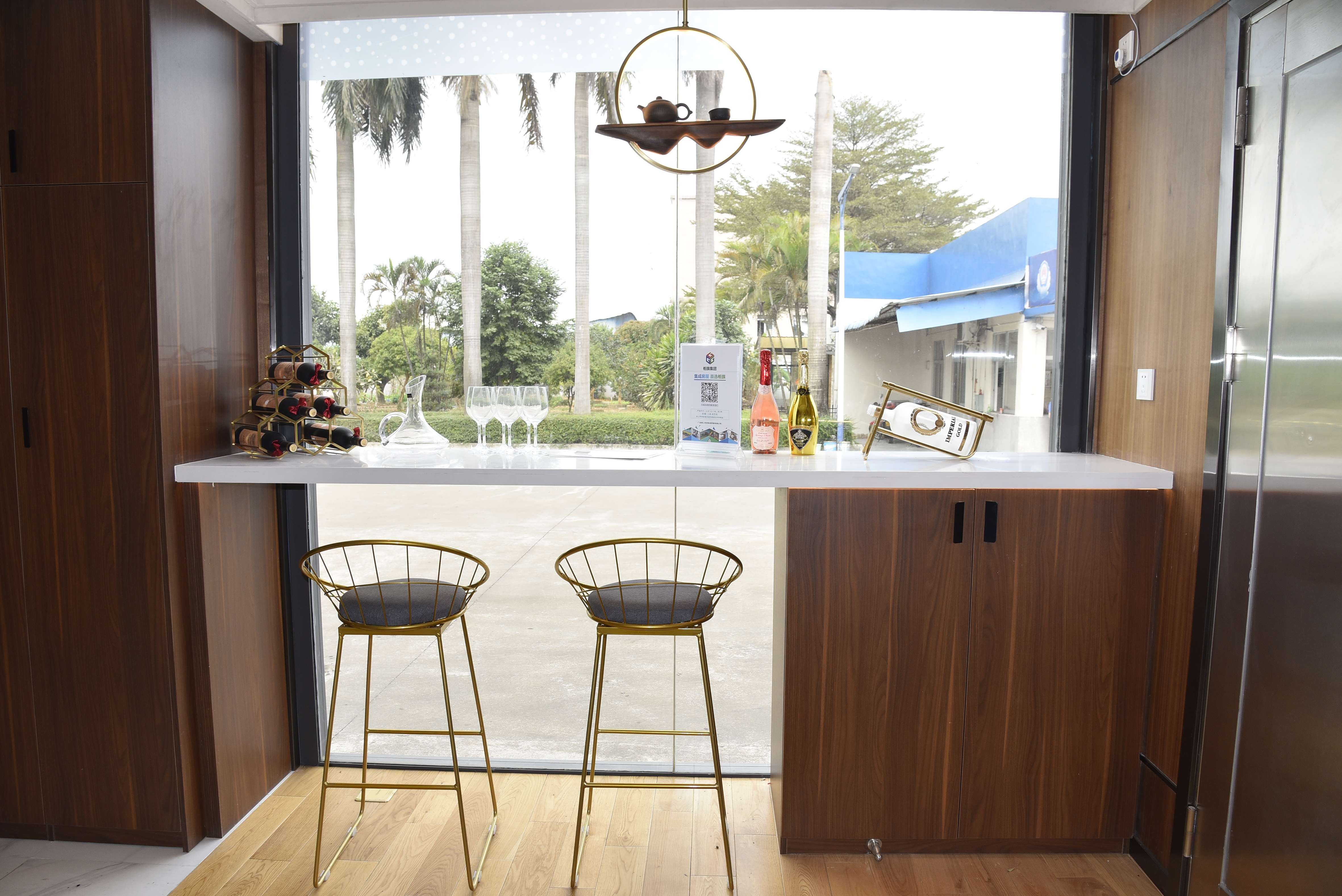 在功能布局上,一層起居、二層休閑。一層進門右邊為吧臺、左邊沙發(fā)茶幾,上部天花為暗藏小玄機的升降床。衛(wèi)生間、洗漱臺與臥室相連,飄窗小陽臺,處處體現(xiàn)的都是居住的方便與舒適。大面積落地窗,就是為風景好的沙灘、海邊等度假地設(shè)計的,室內(nèi)生活溫馨小資、戶外美景賞心悅目,陶醉其中、無限樂趣。